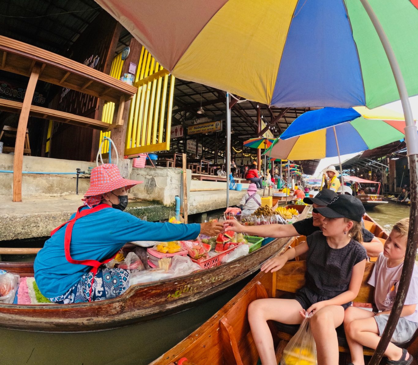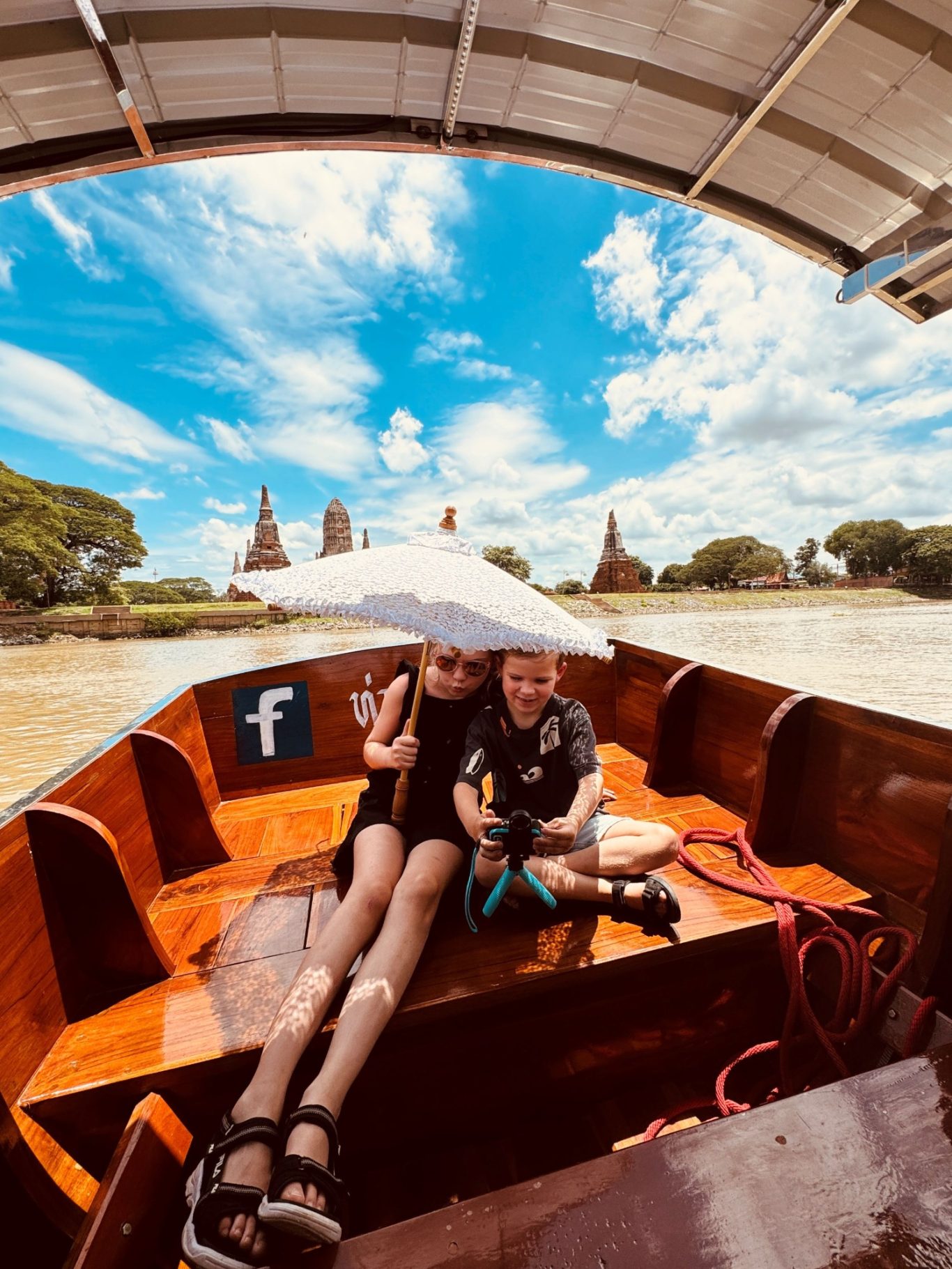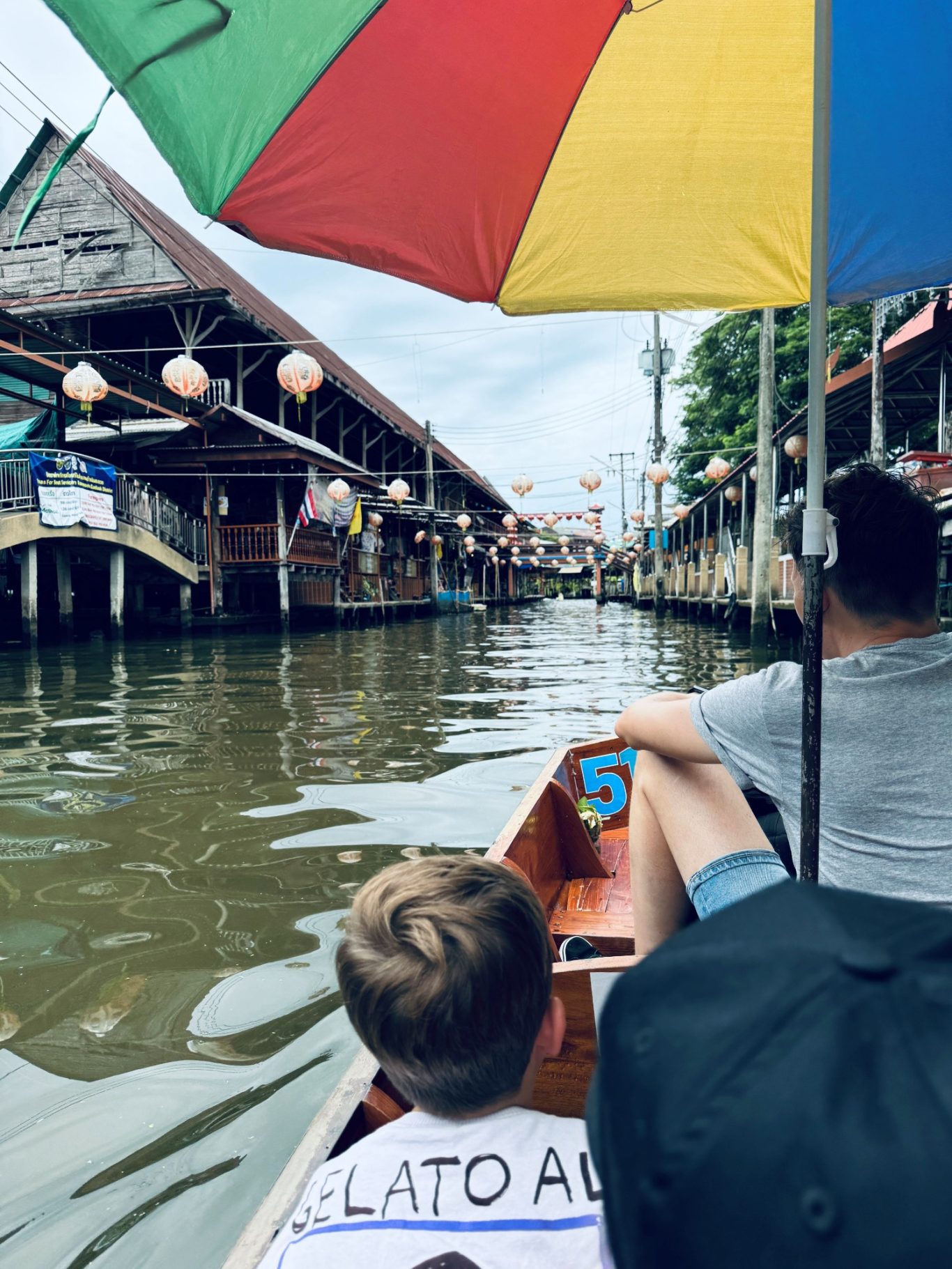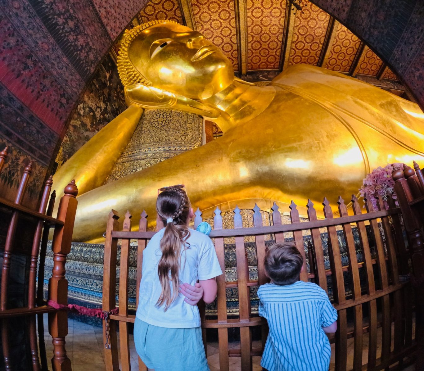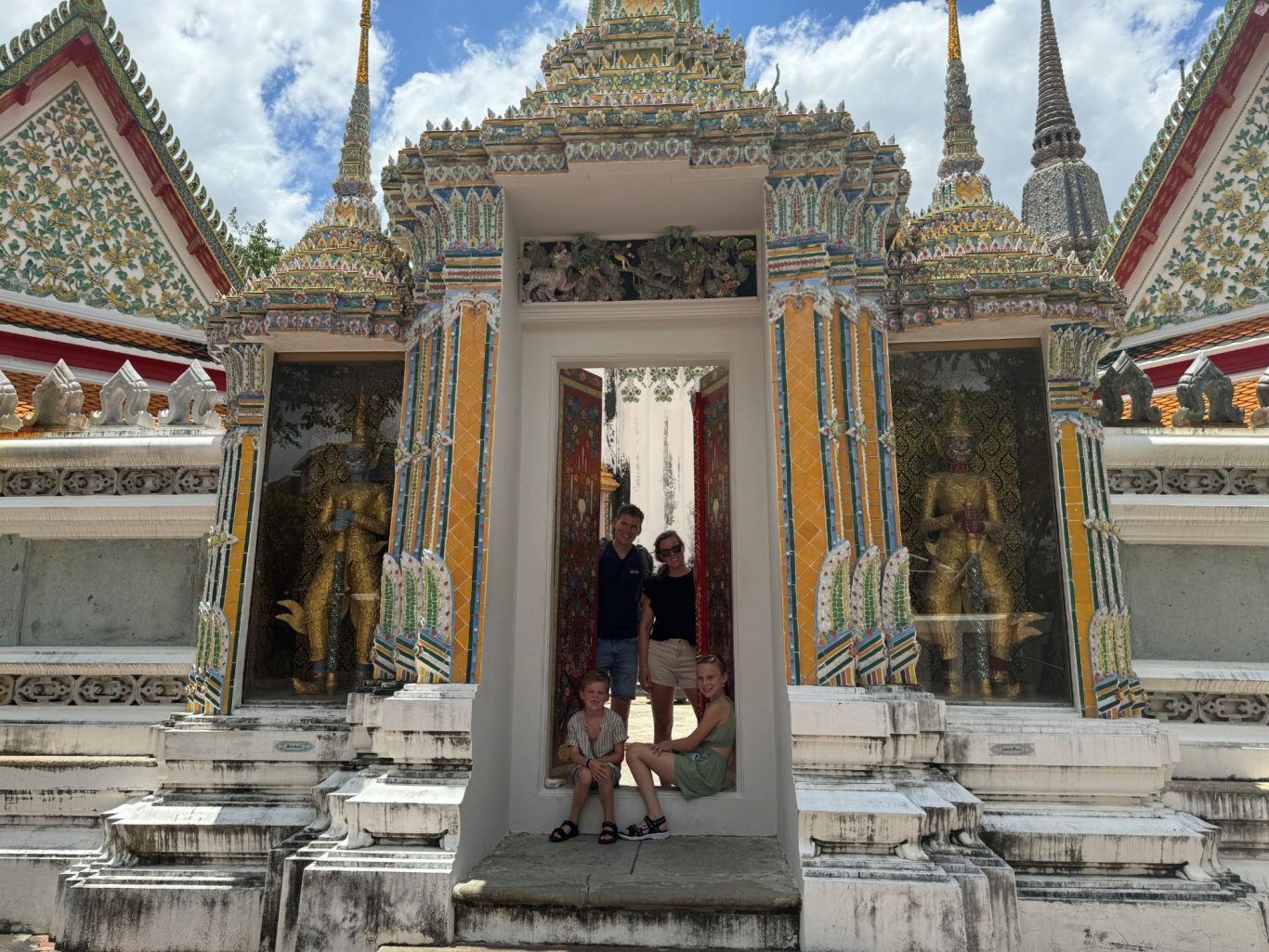 We stapte in een longtailbootje en voerden door de kanalen van Bangkok. Een rustige, bijna sprookjesachtige kant van de stad die je te voet nooit zou ontdekken. We bezochten Wat Pho met de gigantische liggende Boeddha, wat zelfs de kinderen indrukwekkend vonden.